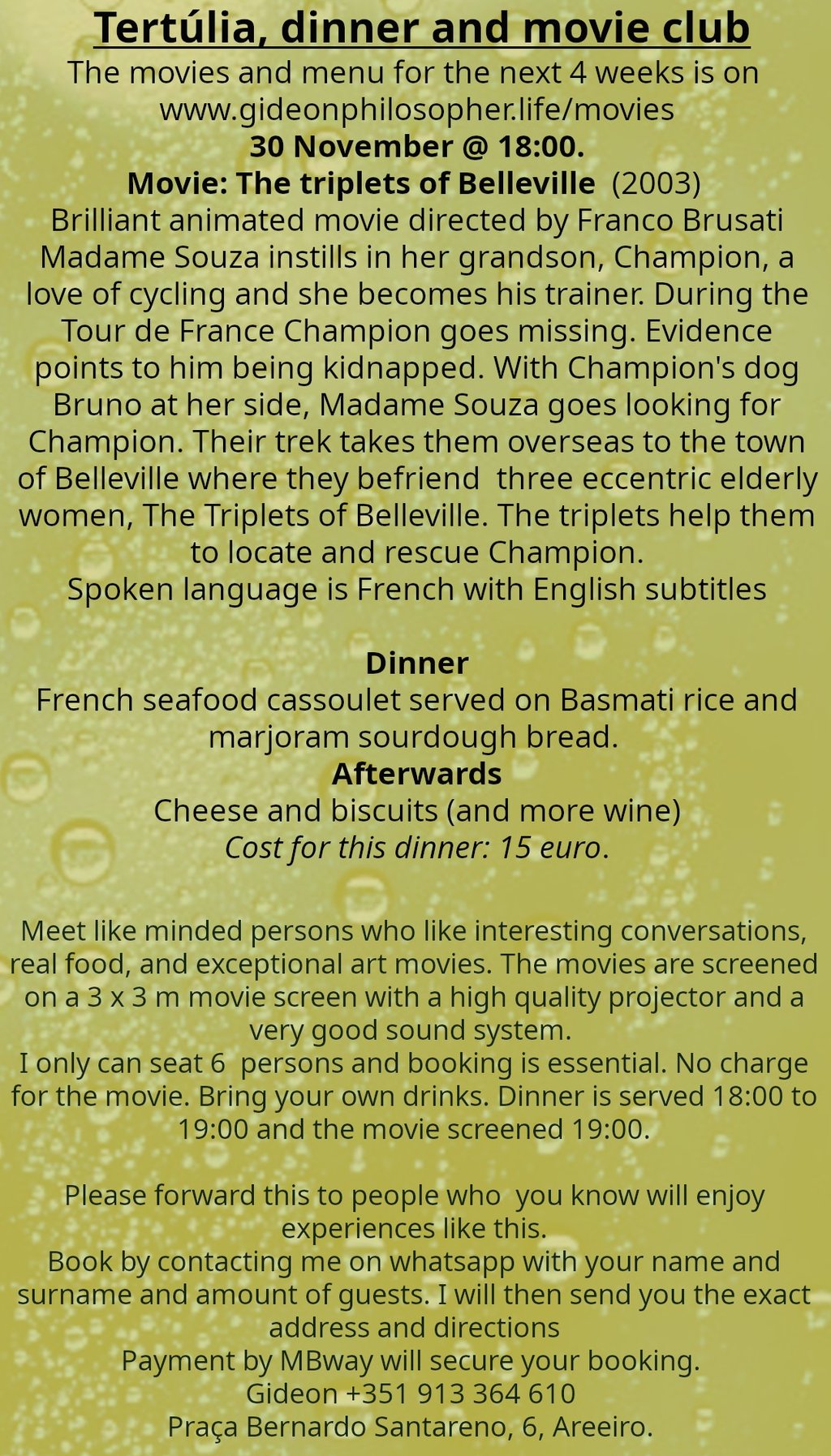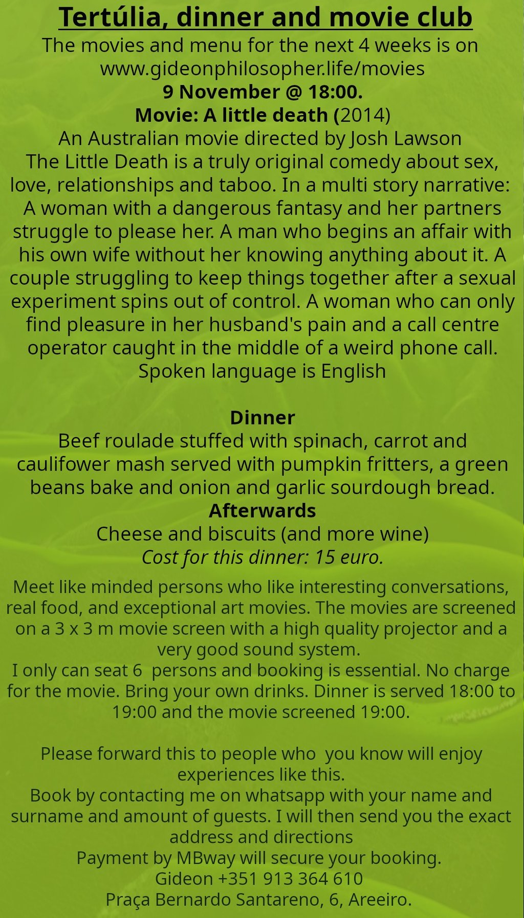 +351 913 364 610 to receive details of the Movie and the dinner on a Monday.