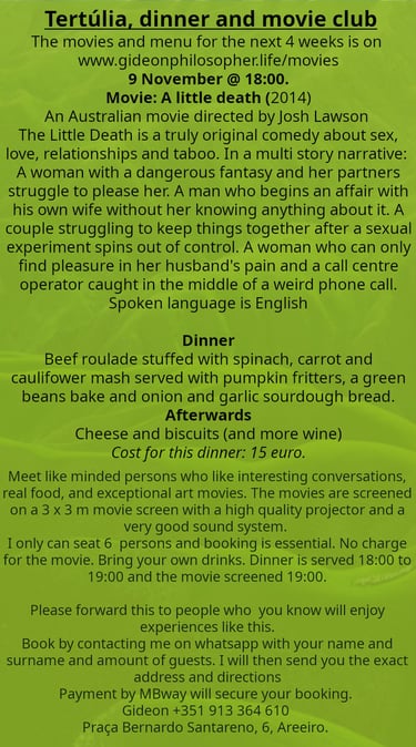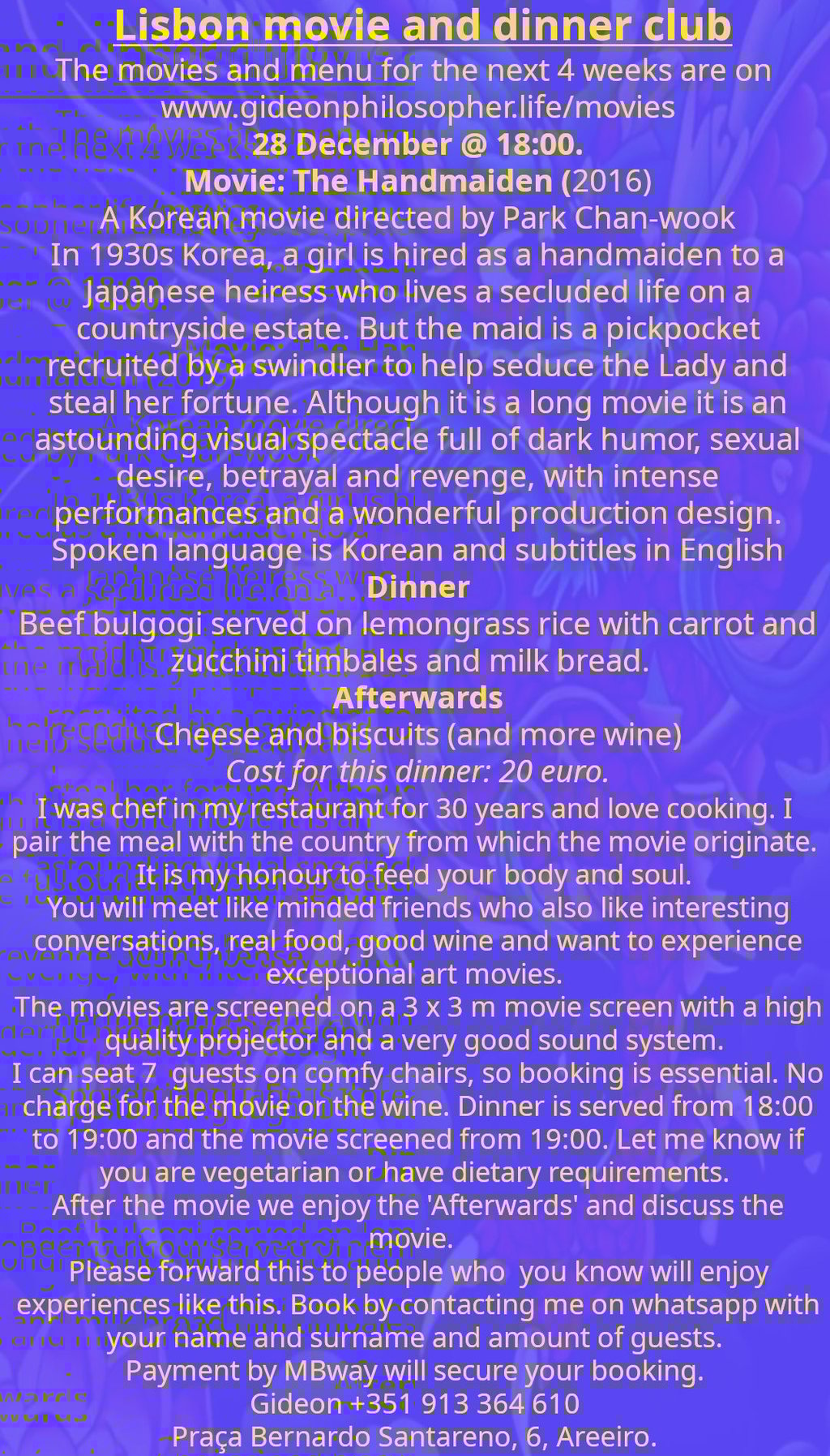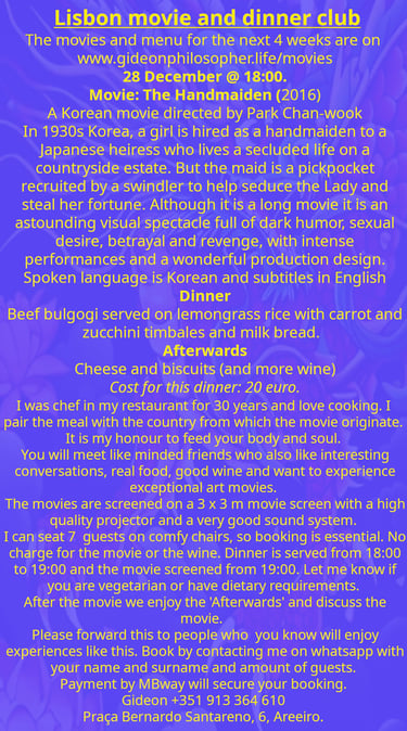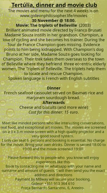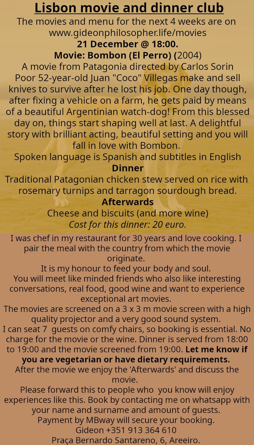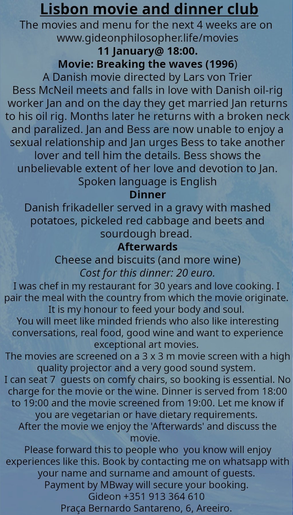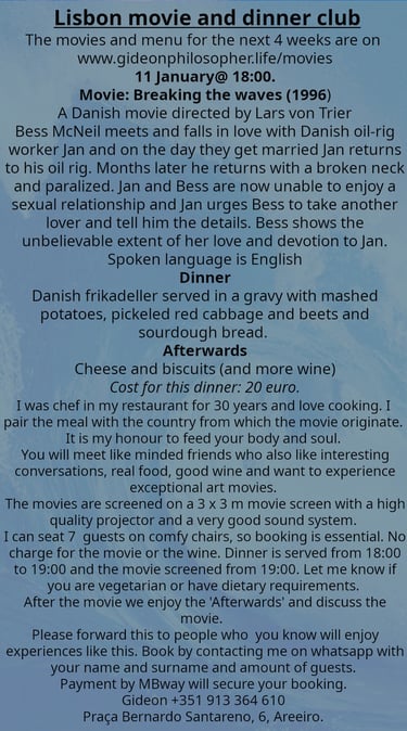 I had a movie club and screend art house movies on Sunday nights. It included a dinner and I want to do the same here at my home in Areeiro, Lisbon.