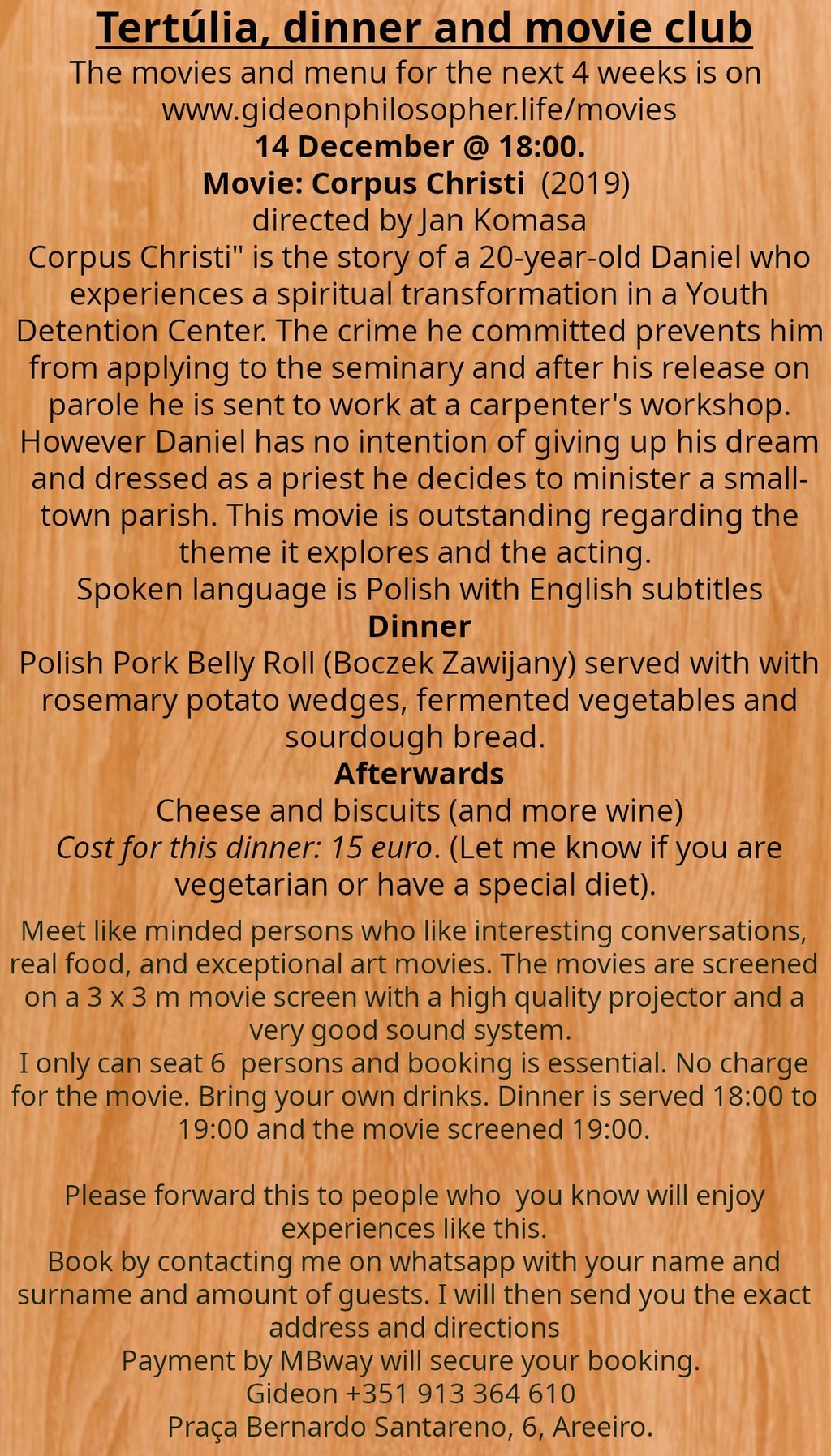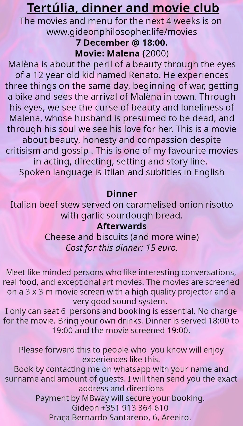 +351 913 364 610 to receive details of the Movie and the dinner on a Monday.