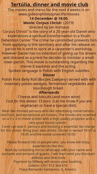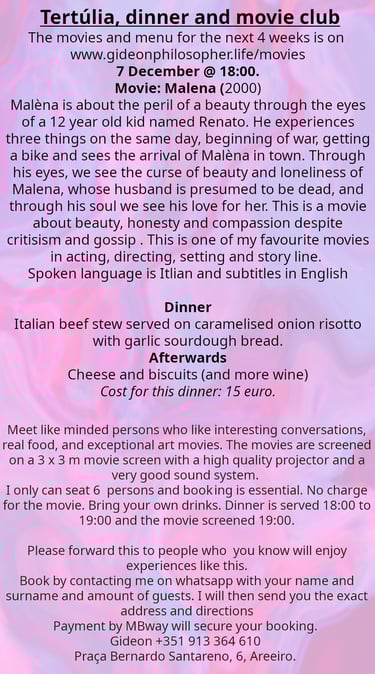 I had a movie club and screend art house movies on Sunday nights. It included a dinner and I want to do the same here at my home in Areeiro, Lisbon.